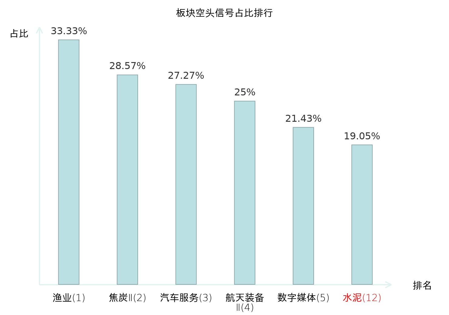 全市场所有行业板块中主力空头信号占比排名中,渔业板块位居第一。电子化学品Ⅱ板块名次提升最快,较昨日上升116位。
