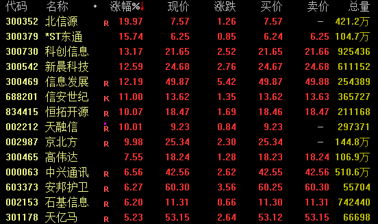 国产软件股盘中强势拉升,截至收盘,北信源20%涨停,科创信息、新晨科技、信息发展等涨超10%;中兴通讯涨超6%,盘中一度涨停,全日成交近220亿元,位居A股成交额首位。