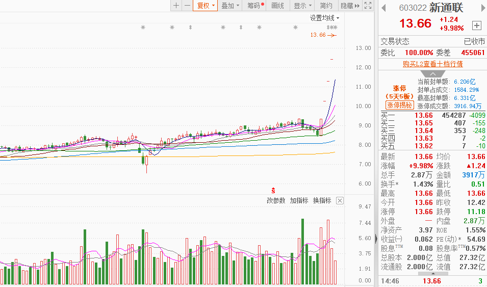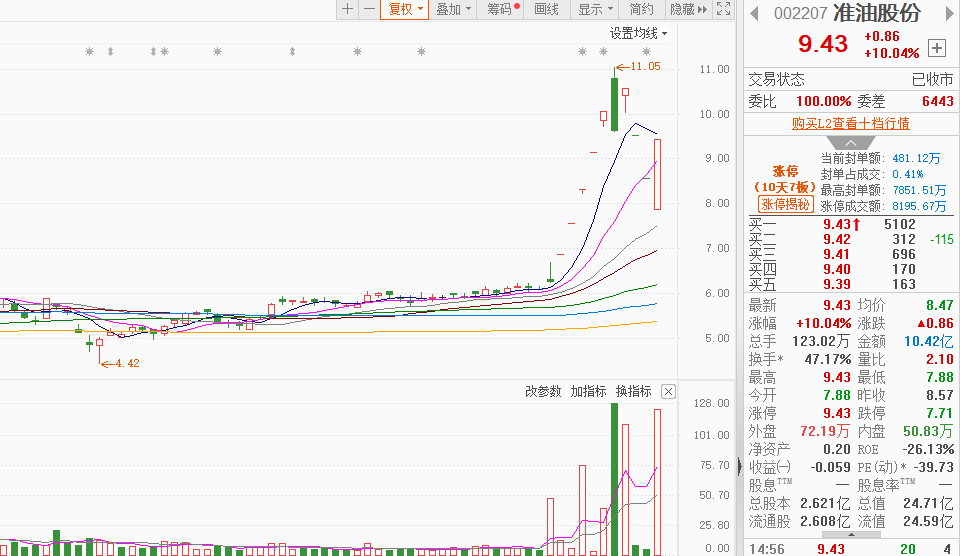 市场情绪:尽管指数冲高回落,但两市成交依旧保持良好。市场热点轮动较快,个股跌多涨少,全市场超3600只个股下跌。今日共63股涨停,连板股总数21只,23股封板未遂,封板率为73%(不含ST股、退市股)。焦点股方面,兴业股份、诺德股份午后炸板跳水,市场连板高度降至5连板的新通联。军工股反复活跃,长城军工7天6板,万里马20CM4天3板。油气股午后反弹,准油股份反包涨停走出10天7板。