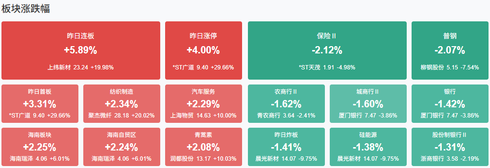 板块方面,短剧游戏、人形机器人、海南、医药商业等板块涨幅居前,保险、钢铁、银行、有色金属等板块跌幅居前。截至收盘,沪指跌0.12%,深成指涨0.11%,创业板指涨0.36%。