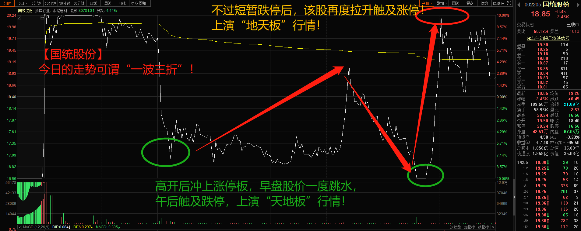 【国统股份】高开后冲上涨停板,早盘股价一度跳水,午后触及跌停,上演“天地板”行情,不过短暂跌停后,该股再度拉升触及涨停,上演“地天板”行情!