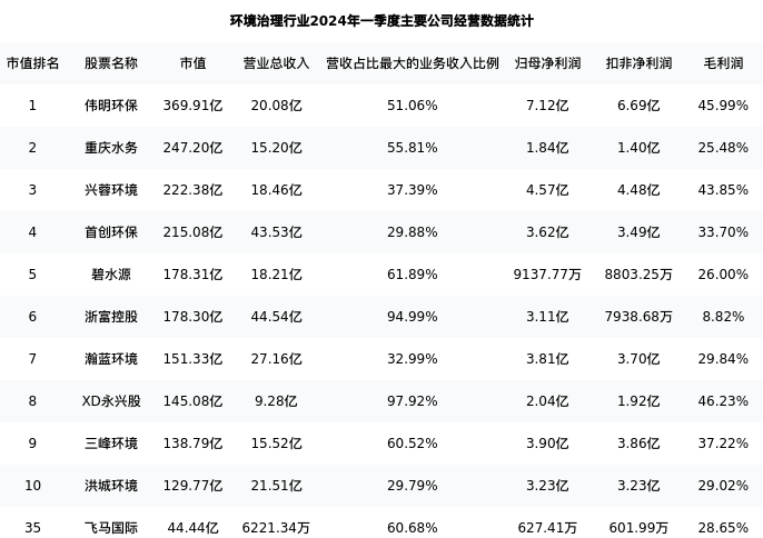 飞马国际最新报告期数据为一季度,下表汇总了环境治理行业内市值靠前的公司一季度主要经营数据