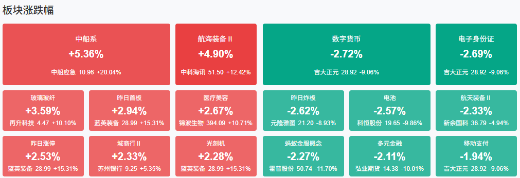 板块方面,中船系、光刻机、银行、创新药等板块涨幅居前,多元金融、跨境支付、固态电池、铜缆高速连接等板块跌幅居前。截至收盘,沪指涨0.21%,深成指跌0.32%,创业板指跌0.58%。