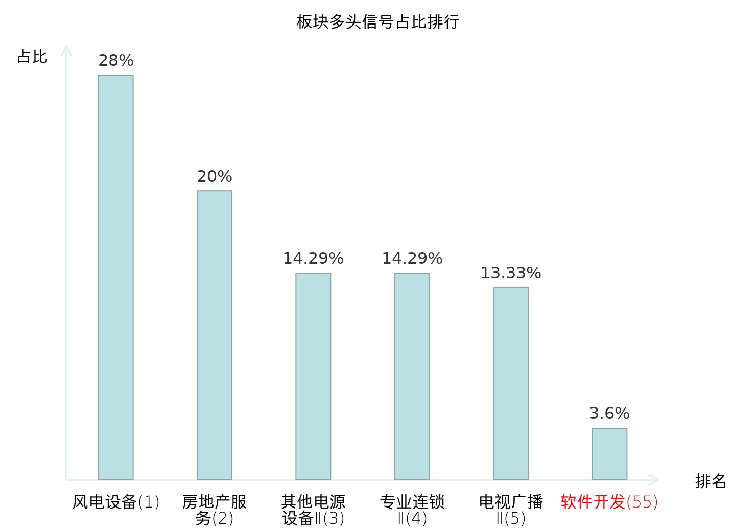 全市场所有行业板块中主力多头信号占比排名中,风电设备板块位居第一。专业连锁Ⅱ板块名次提升最快,较昨日上升116位。