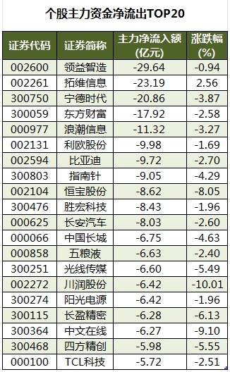 今日有3136只个股被主力资金净卖出,其中,277股被主力资金净卖出超1亿元。主力资金净流出最多的个股是领益智造,净流出金额为29.64亿元;主力资金净流出居前的个股还有拓维信息宁德时代东方财富浪潮信息利欧股份等,净流出金额分别为23.19亿元、20.86亿元、17.92亿元、11.32亿元、9.98亿元。