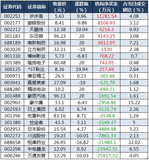 盘后龙虎榜数据显示,今日机构席位资金合计净卖出约6.69亿元。其中,净买入的个股9只,净卖出的个股13只。机构净买入最多的股票是步步高,净买入金额约1.13亿元;机构净买入居前的还有御银股份天融信东田微等股。机构净卖出最多的股票是万通发展,净卖出金额约2.59亿元;机构净卖出居前的还有中电鑫龙悦康药业川润股份等股。