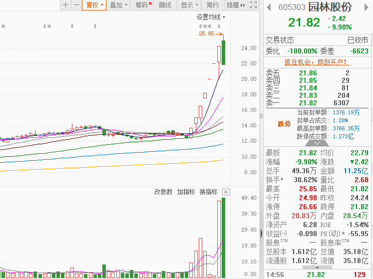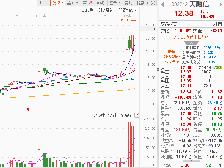 市场情绪:个股跌多涨少,全市场超4700只个股下跌。今日共41股涨停,连板股总数12只,46股封板未遂,封板率为47%(不含ST股、退市股)。焦点股方面,园林股份跌停,市场连板高度降至4连板的天普股份,并购重组的开普云20CM3连板。此外,算力硬件股剑桥科技走出8天5板,数字货币概念股天融信5天4板。