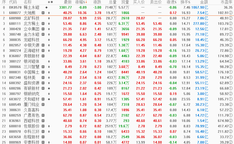 事件驱动:稀土永磁概念股震荡走高,北矿科技涨停,龙磁科技涨超5%,北方稀土、金力永磁、大地熊、中国稀土、盛和资源、正海磁材等跟涨。消息面上,北方稀土昨晚发布半年报,公司上半年实现营业收入188.66亿元,同比增长45.24%;归属于上市公司股东的净利润9.31亿元,同比大幅增长1951.52%。