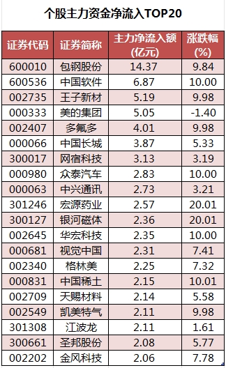 个股来看,今日有1613只个股获主力资金净流入,其中,62股获主力资金净流入超1亿元。包钢股份主力资金净流入最多,净流入金额为14.37亿元;主力资金净流入居前的个股还有中国软件、王子新材、美的集团、多氟多、中国长城等,净流入金额分别为6.87亿元、5.19亿元、5.05亿元、4.01亿元、3.87亿元。