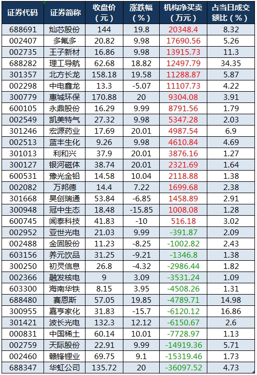 盘后龙虎榜数据显示,今日机构席位资金合计净买入约2.8亿元。其中,净买入的个股18只,净卖出的个股13只。机构净买入最多的股票是灿芯股份,净买入金额约2.03亿元;机构净买入居前的还有多氟多、王子新材、理工导航、北方长龙、中电鑫龙等股。机构净卖出最多的股票是华虹公司,净卖出金额约3.61亿元;机构净卖出居前的还有赣锋锂业、天际股份、中国稀土等股。