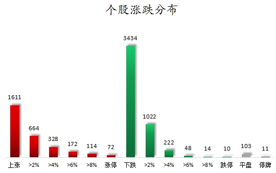 个股涨跌情况,截至收盘,沪深两市合计1611只个股上涨,3434只个股下跌,平盘个股103只,停牌的个股11只。不含当日上市新股,共有72只个股涨停,10只个股跌停。