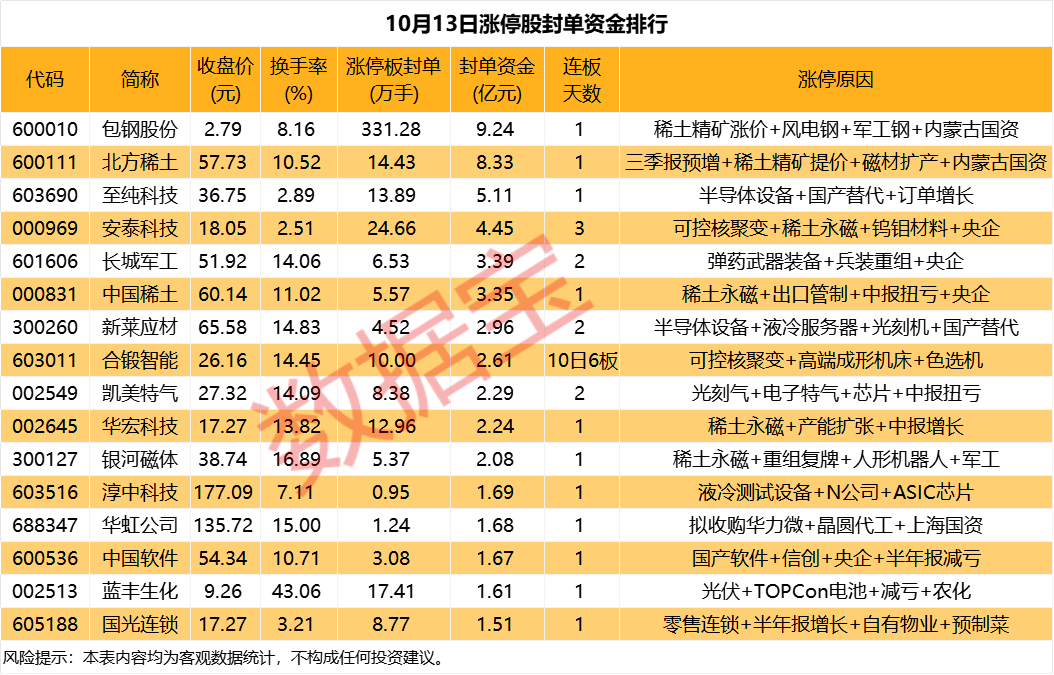 据证券时报·数据宝统计,10月13日,从收盘涨停板封单量看,包钢股份封单量高达331.28万手;宝泰隆、安泰科技、白银有色分列第二到第四位,封单量均在20万手以上。