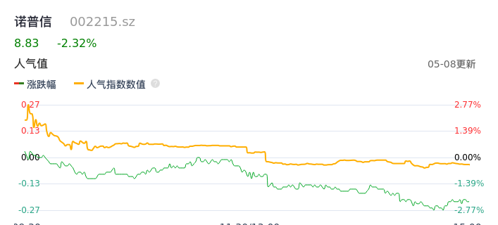05月08日,诺普信收报8.83,股价涨幅-2.32%,成交金额2.61亿元,换手率3.68%。