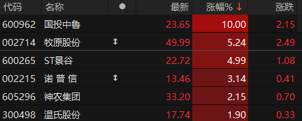上证报中国证券网讯 8月21日早盘,农林牧渔板块震荡走高,截至9时57分,国投中鲁涨停。牧原股份涨超5%,诺普信神农集团等跟涨。