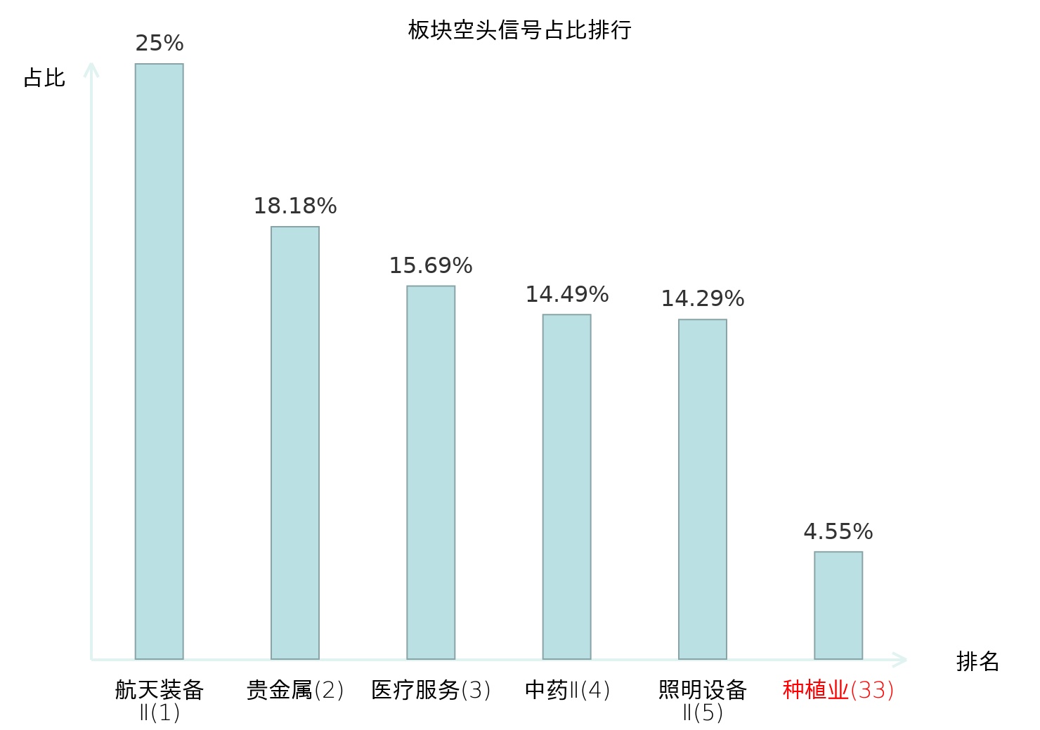 全市场所有行业板块中主力空头信号占比排名中,航天装备Ⅱ板块位居第一。物流板块名次提升最快,较昨日上升112位。