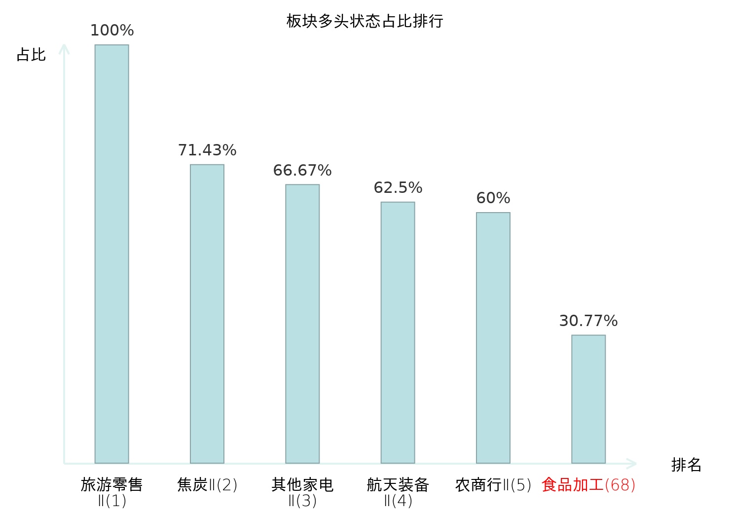 全市场所有行业板块中主力多头状态占比排名中,旅游零售Ⅱ板块位居第一。白酒Ⅱ板块名次提升最快,较昨日上升50位。