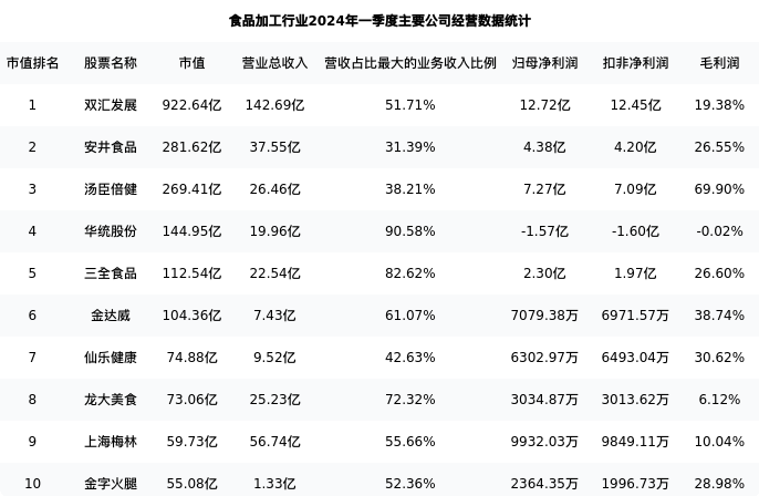三全食品最新报告期数据为一季度,下表汇总了食品加工行业内市值靠前的公司一季度主要经营数据