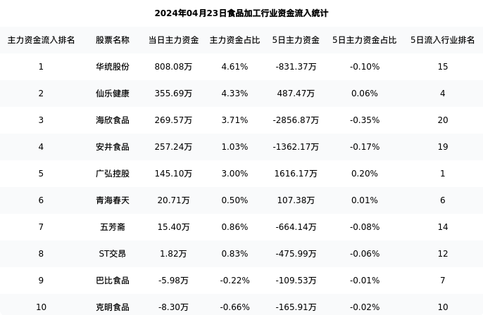 三全食品今日净流出126.32万元,主力占比2.66%,在行业内排名:13/23;5日净流入1037.81万元,主力占比0.13%,在行业内排名:2/23。