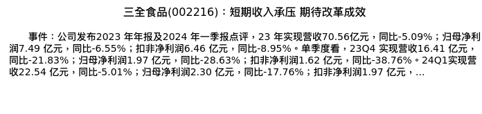 值得注意的是:2024年04月民生证券的王言海/张玲玉分析师,首次发布关于三全食品的研究报告,标题为:三全食品(002216):短期收入承压 期待改革成效。