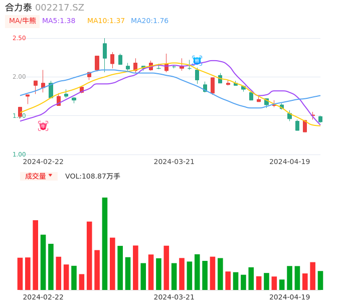04月19日,合力泰收报1.42,股价涨幅-5.96%,成交金额1.57亿元,换手率3.50%。
