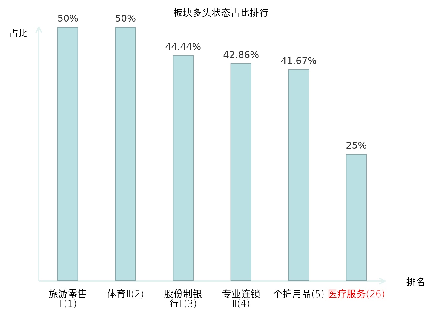 全市场所有行业板块中主力多头状态占比排名中,旅游零售Ⅱ板块位居第一。贵金属板块名次提升最快,较昨日上升83位。