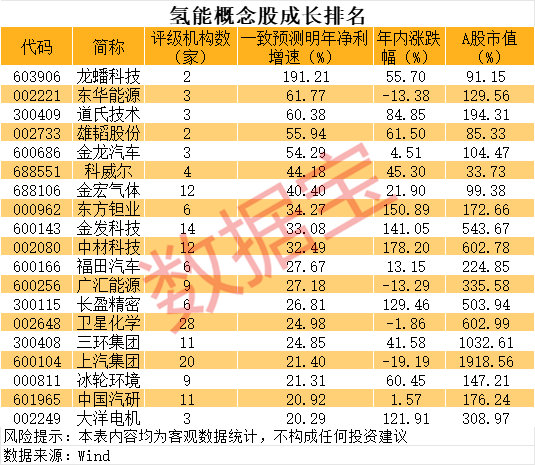 从成长性来看,根据机构一致预测,两家机构以上评级个股中,有19只概念股明年净利增速超20%。其中,龙蟠科技增速位居第一,超过191%,东华能源、道氏技术、雄韬股份等个股增速均超50%。