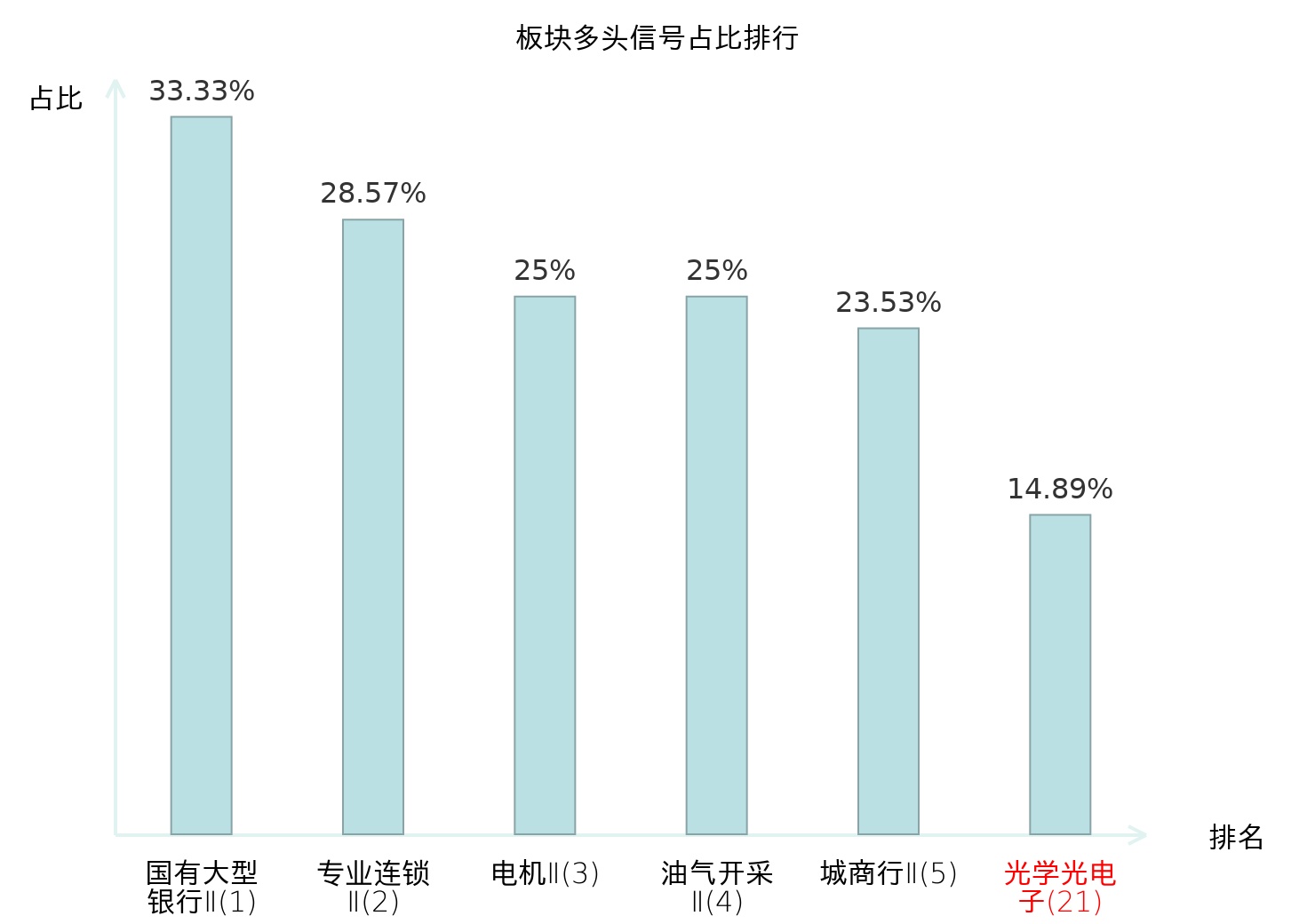 全市场所有行业板块中主力多头信号占比排名中,国有大型银行Ⅱ板块位居第一。油气开采Ⅱ板块名次提升最快,较昨日上升123位。