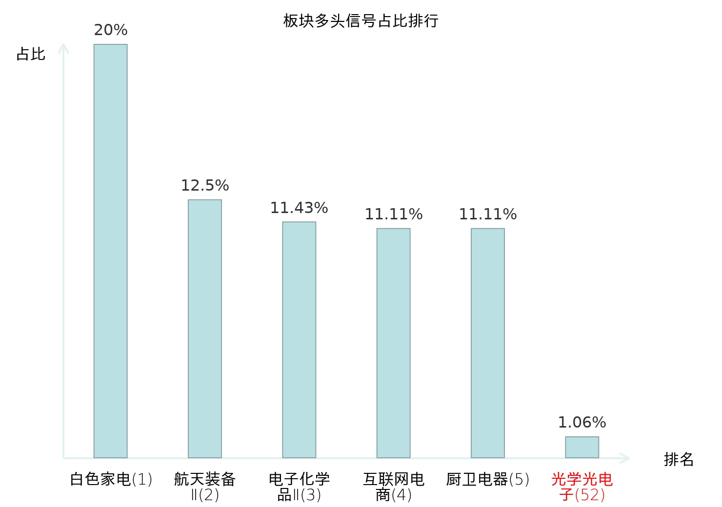 全市场所有行业板块中主力多头信号占比排名中,白色家电板块位居第一。航天装备Ⅱ板块名次提升最快,较昨日上升118位。