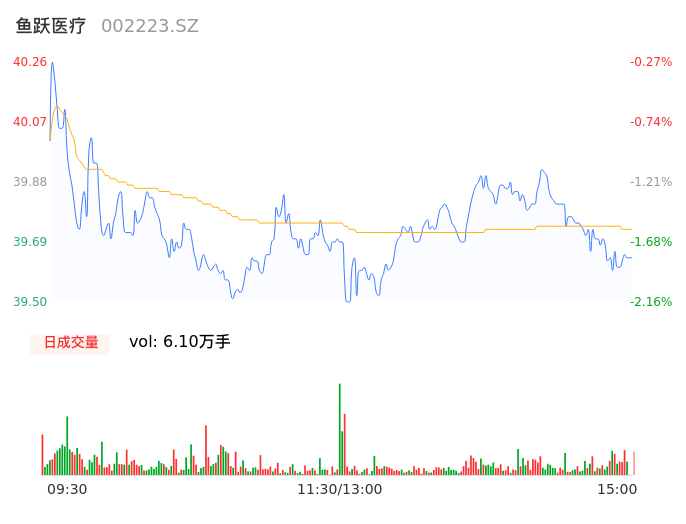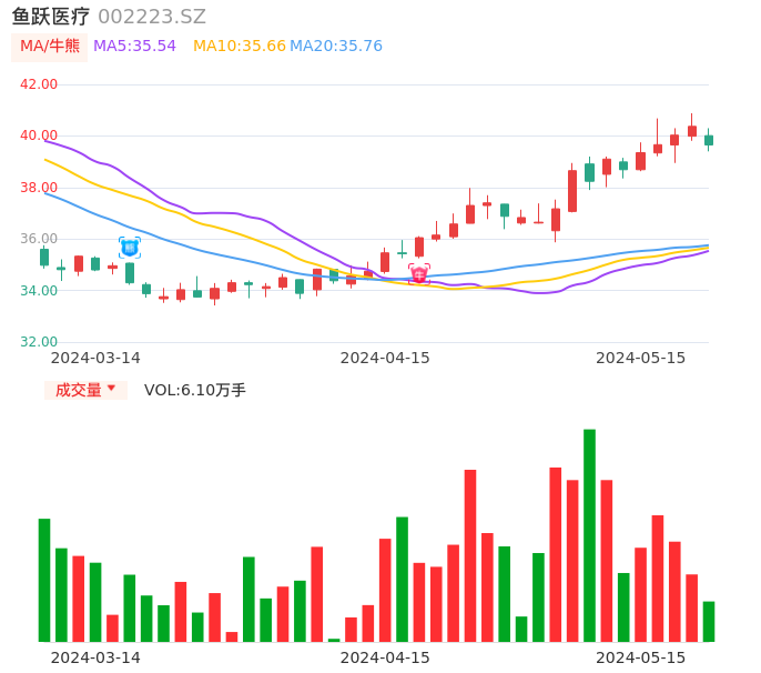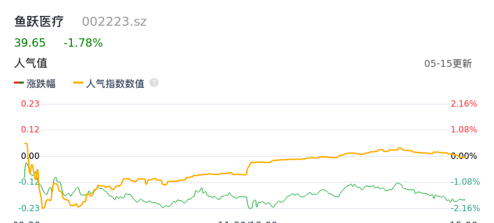 05月15日,鱼跃医疗收报39.65,股价涨幅-1.78%,成交金额2.42亿元,换手率0.65%。