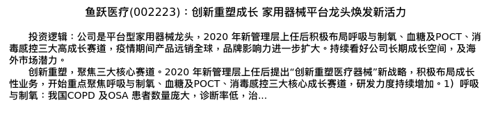 值得注意的是:2024年05月华源证券的刘闯分析师,首次发布关于鱼跃医疗的研究报告,标题为:鱼跃医疗(002223):创新重塑成长 家用器械平台龙头焕发新活力。