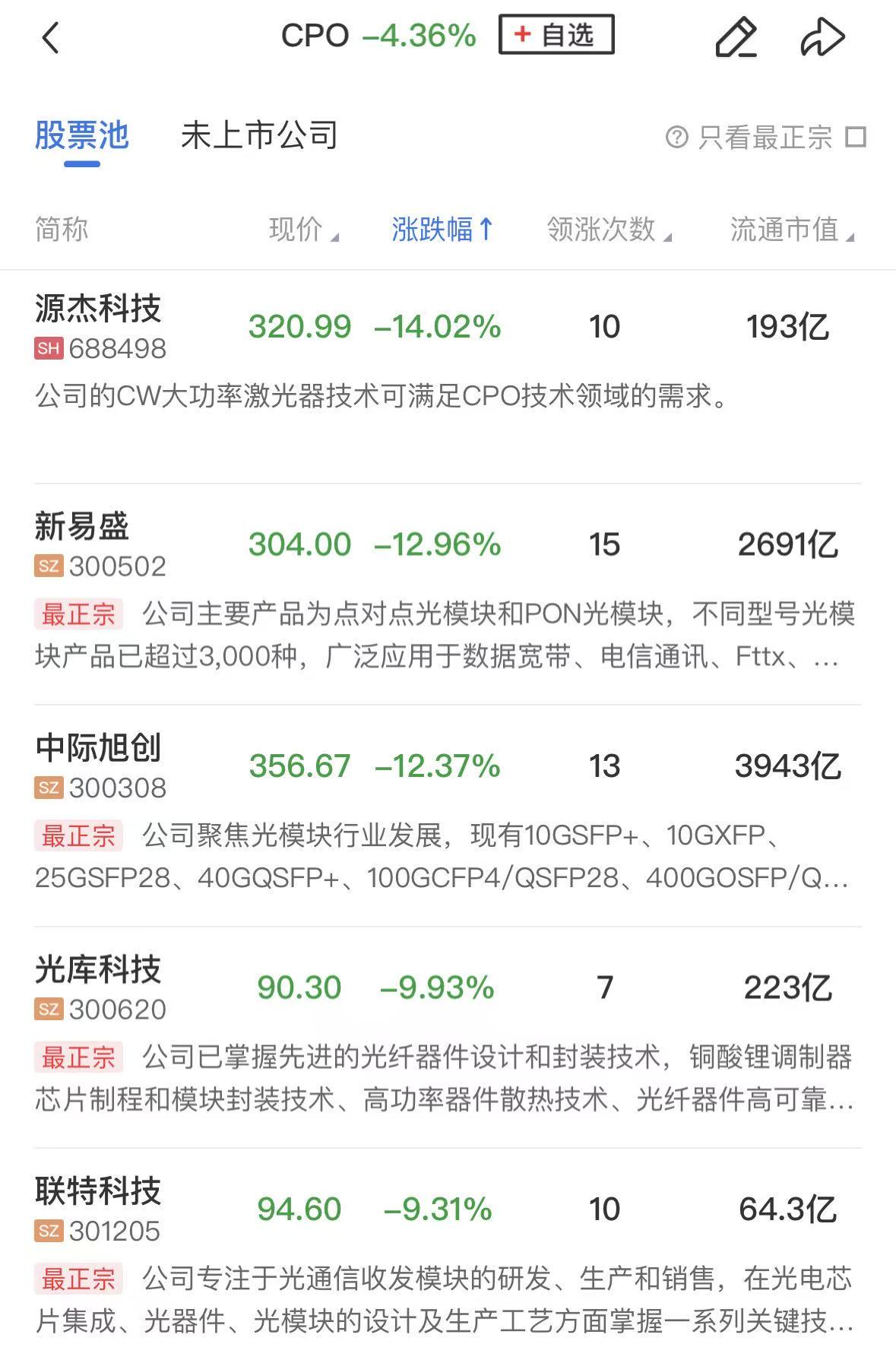 算力硬件方向再遭重挫,源杰科技新易盛中际旭创生益电子胜宏科技跌超10%,长飞光纤跌停。