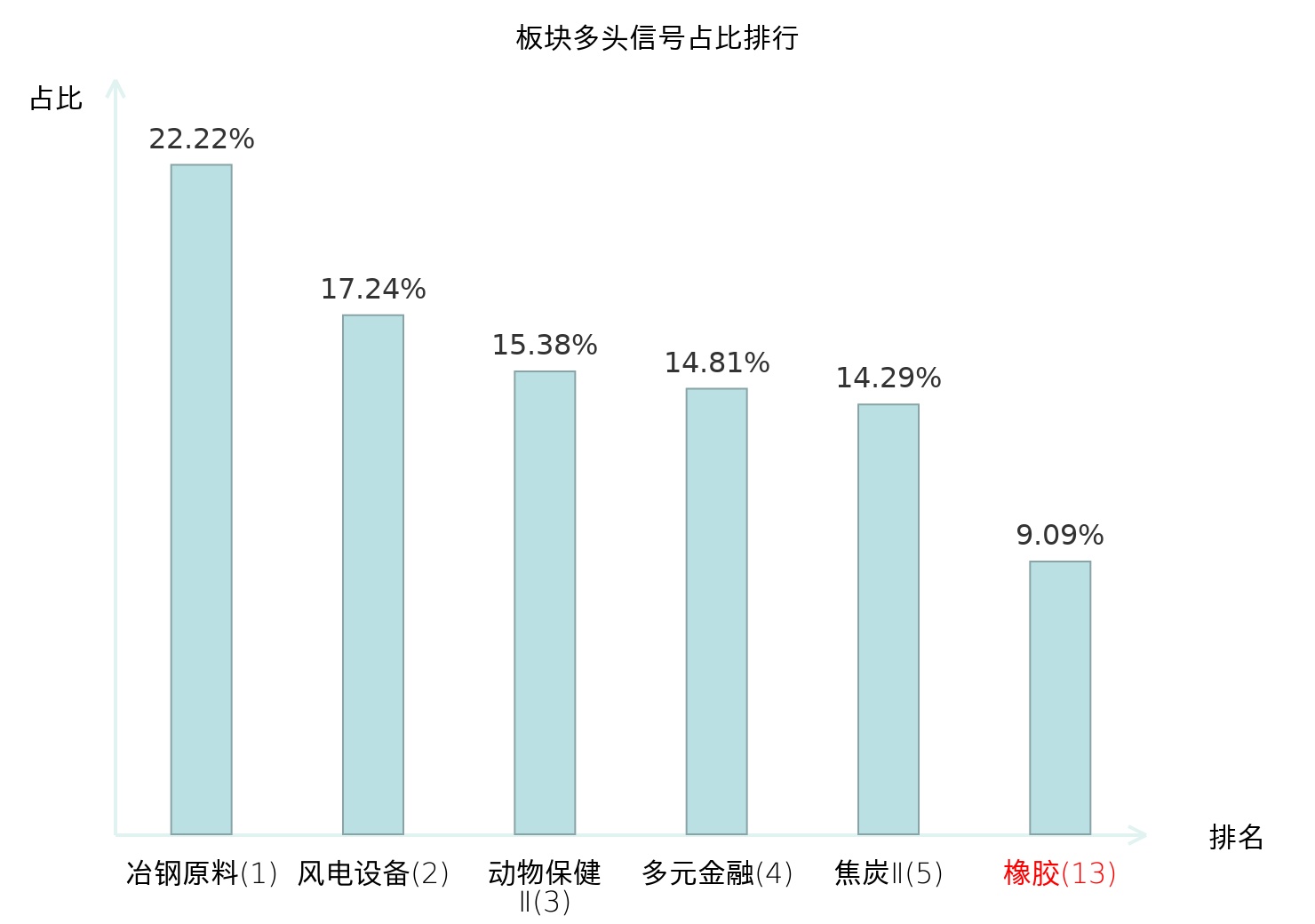 全市场所有行业板块中主力多头信号占比排名中,冶钢原料板块位居第一。冶钢原料板块名次提升最快,较昨日上升118位。