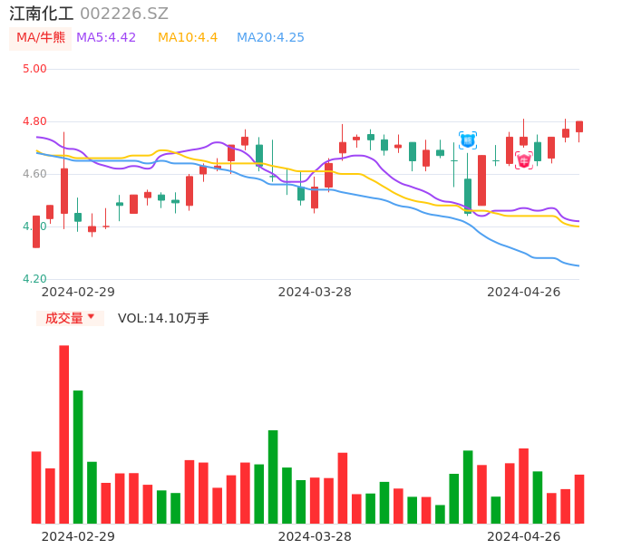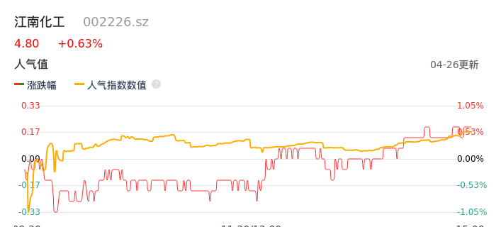 04月26日,江南化工收报4.80,股价涨幅0.63%,成交金额6715.44万元,换手率0.77%。