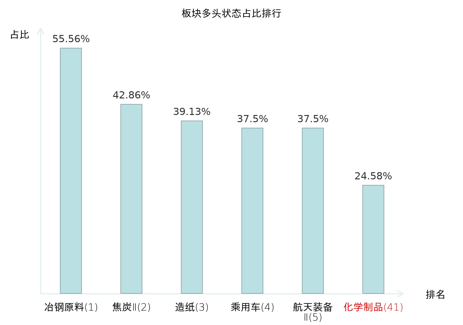 全市场所有行业板块中主力多头状态占比排名中,冶钢原料板块位居第一。房屋建设Ⅱ板块名次提升最快,较昨日上升84位。