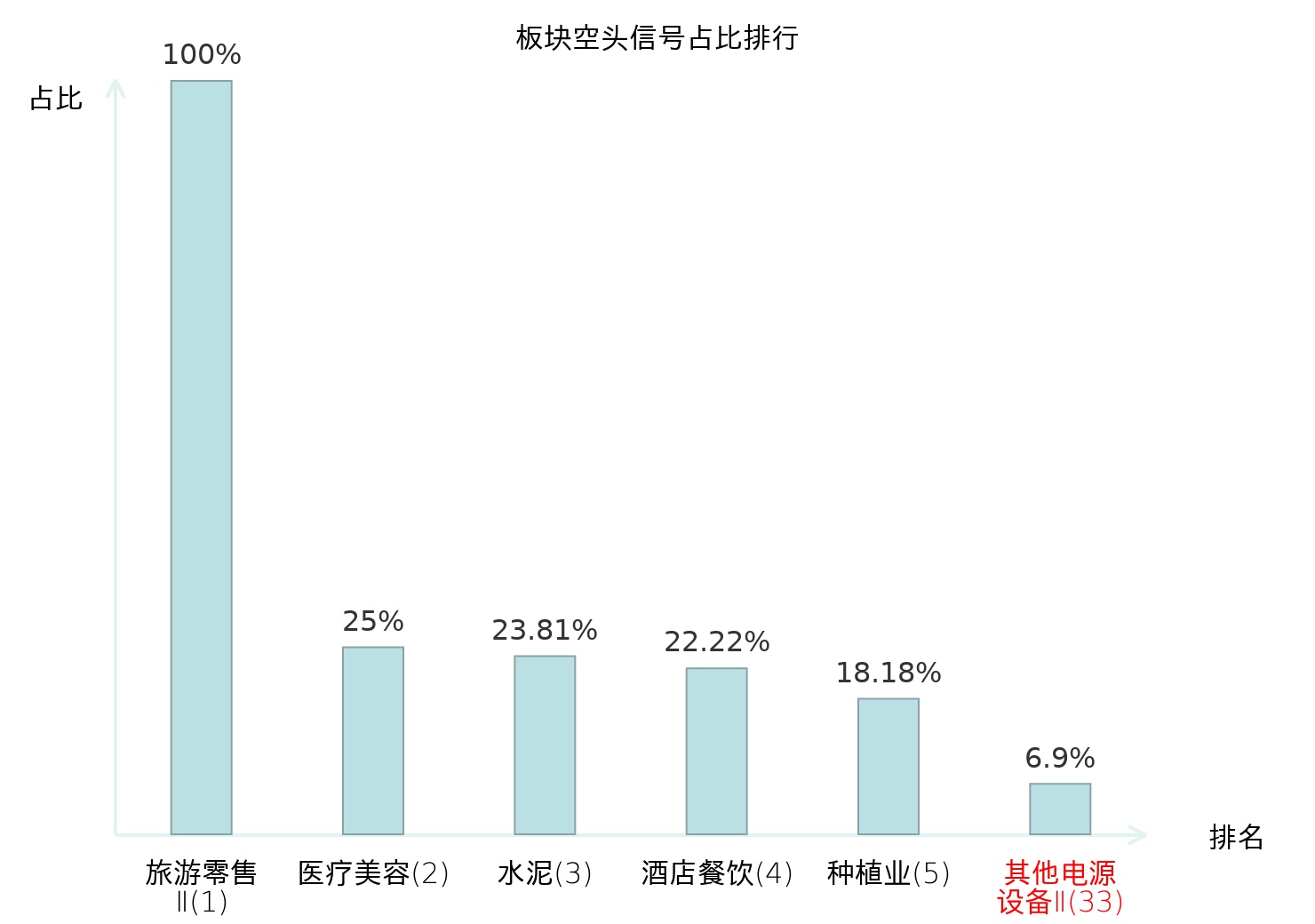 全市场所有行业板块中主力空头信号占比排名中,旅游零售Ⅱ板块位居第一。装修建材板块名次提升最快,较昨日上升112位。