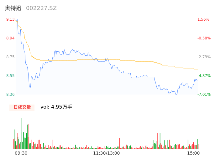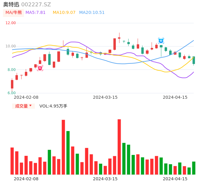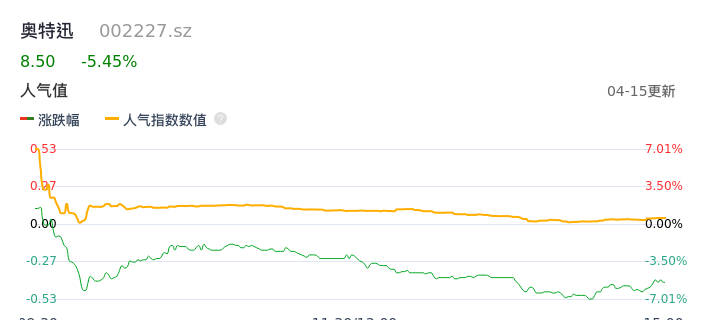 04月15日,奥特迅收报8.50,股价涨幅-5.45%,成交金额4270.68万元,换手率2.00%。