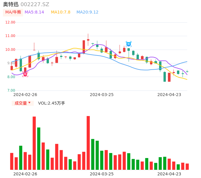 奥特迅在4月2日出现日线级别熊点,虽然60分钟处于牛点区间,短期有所弱势反弹,但股价目前整体处于中期下降通道,建议在日线级别未转为牛点信号前继续谨慎观望。