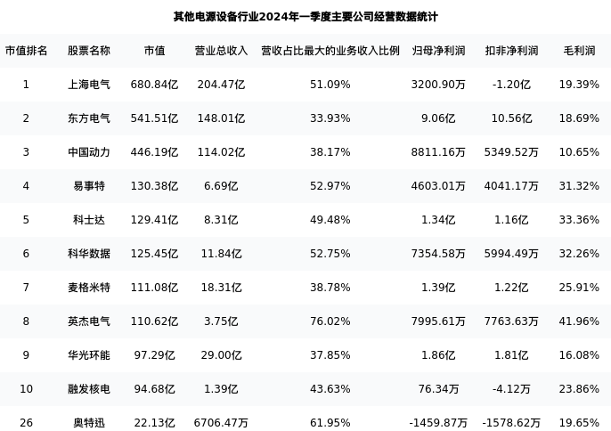 奥特迅最新报告期数据为一季度,下表汇总了其他电源设备行业内市值靠前的公司一季度主要经营数据