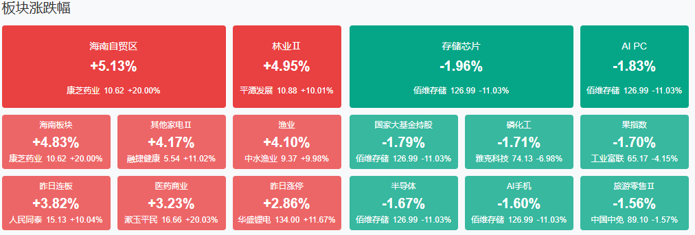 板块方面,海南、燃气、医药、福建等板块涨幅居前,存储芯片、CPO等板块跌幅居前。截至收盘,沪指跌0.16%,深成指跌1.1%,创业板指跌1.74%。