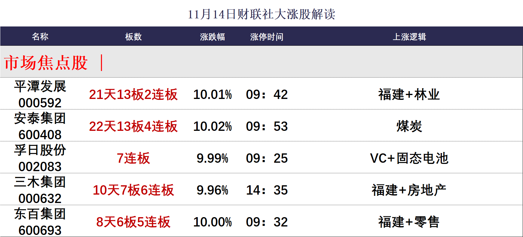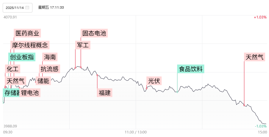 财联社11月14日讯,今日70股涨停,29股炸板,封板率为71%,孚日股份7连板,三木集团10天7板,东百集团8天6板,人民同泰国晟科技5连板,胜利股份4连板,真爱美家九牧王石大胜华3连板,平潭发展21天13板,安泰集团22天13板。市场全天震荡调整,沪指跌近1%,创业板指跌近3%。沪深两市成交额1.96万亿,较上一个交易日缩量839亿。盘面上,市场热点较为杂乱,全市场超3300只个股下跌。板块方面,海南、燃气、医药、福建等板块涨幅居前,存储芯片、CPO等板块跌幅居前。截至收盘,沪指跌0.97%,深成指跌1.93%,创业板指跌2.82%。