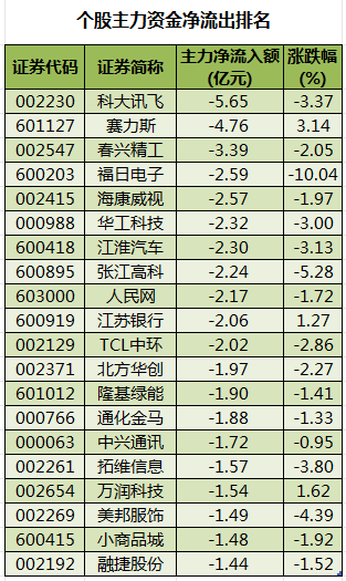 此外,3179只个股被主力资金净卖出,其中,36股被主力资金净卖出超1亿元。主力资金净流出最多的个股是科大讯飞,净流出金额为5.65亿元;主力资金净流出居前的个股还有赛力斯、春兴精工、福日电子、海康威视、华工科技,净流出金额分别为4.76亿元、3.39亿元、2.59亿元、2.57亿元、2.32亿元。