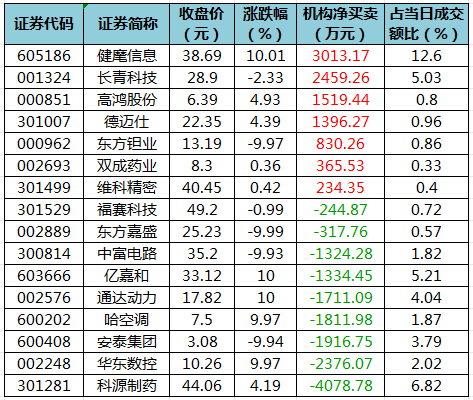 盘后龙虎榜数据显示,今日机构席位资金合计净卖出约5297.75万元。其中,净买入的个股7只,净卖出的个股9只。机构净买入最多的股票是健麾信息,净买入金额约3013.17万元;机构净买入居前的还有长青科技、高鸿股份等股。机构净卖出最多的股票是科源制药,净卖出金额约4078.78万元;机构净卖出居前的还有华东数控、安泰集团等股。