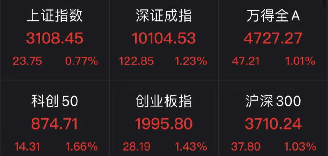 上午收盘,上证指数上涨0.77%,深证成指上涨1.23%,创业板指上涨1.43%。逾4000只个股上涨,成交额约为4452亿元,与昨日上午相比,放量逾950亿元。北向资金净流入48.56亿元。