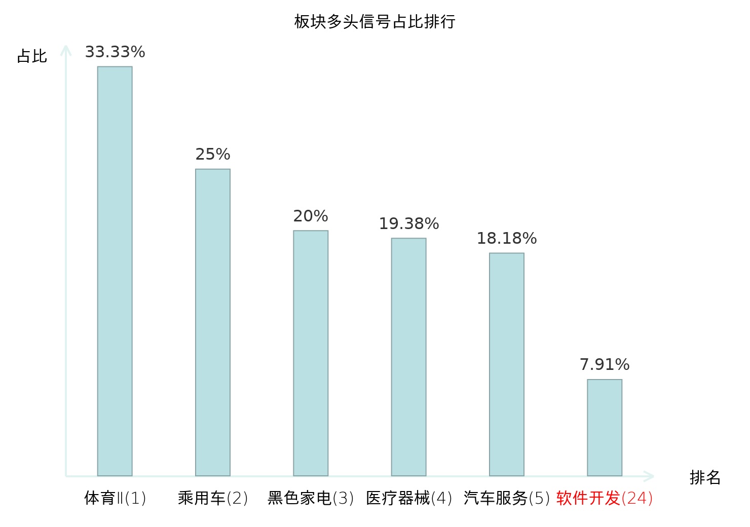 全市场所有行业板块中主力多头信号占比排名中,体育Ⅱ板块位居第一。体育Ⅱ板块名次提升最快,较昨日上升130位。