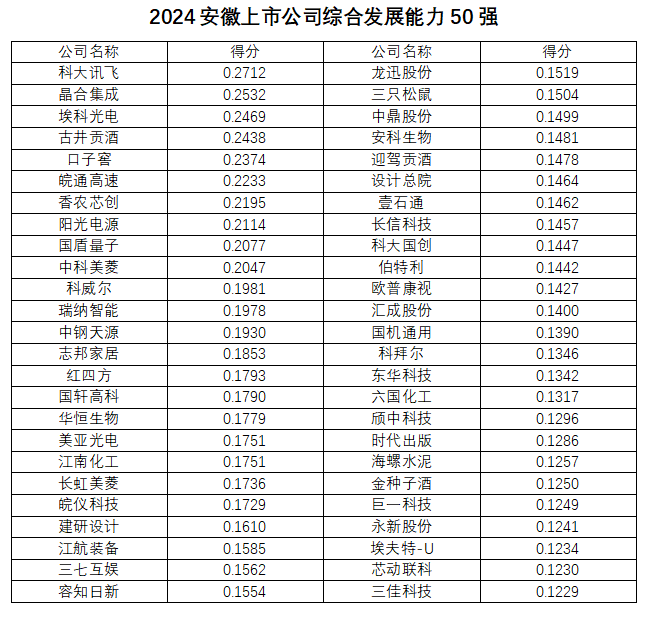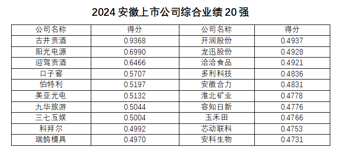 论坛同步发布了安徽上市公司系列榜单。综合发展能力50强中,科大讯飞位列第一,晶合集成、埃科光电等公司表现突出。综合业绩排名前三的分别为古井贡酒、阳光电源和迎驾贡酒。此外,论坛还发布了总投资规模、营运能力、创新能力及ESG绩效等专项20强榜单,多维度展现安徽上市公司的发展态势。