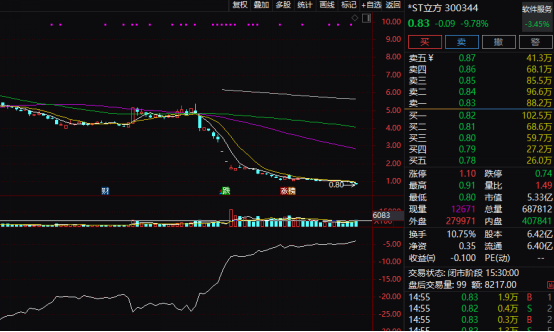 *ST立方(300344)则是自2025年11月下旬开启股价连续下跌之旅,公司股价从超过5元跌至目前仅0.83元,不到两个月的时间里股价累计跌幅已经超过80%。从2026年1月13日开始*ST立方股价跌破1元,截至目前已连续3个交易日收盘价低于1元。