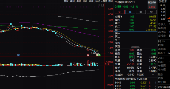 *ST奥维(002231)则于今日跌破1元,最新股价报0.99元,最近一个月时间里公司股价已经“腰斩”。