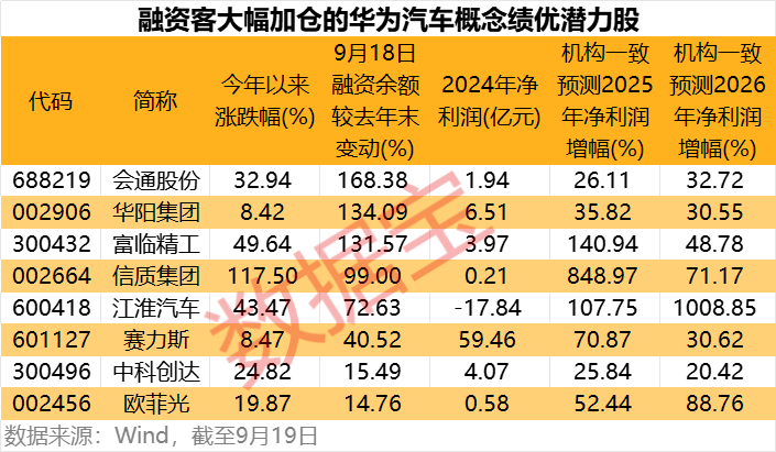 进一步来看,最新融资余额较去年末增加超过10%,且机构一致预测2025年、2026年净利润增幅有望持续超过20%的华为汽车概念股仅有8只。