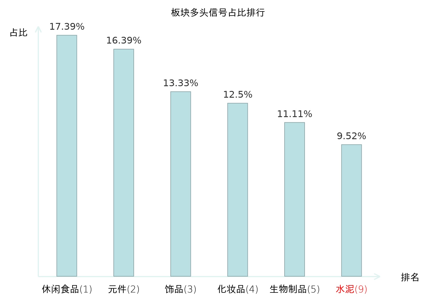 全市场所有行业板块中主力多头信号占比排名中,休闲食品板块位居第一。厨卫电器板块名次提升最快,较昨日上升108位。