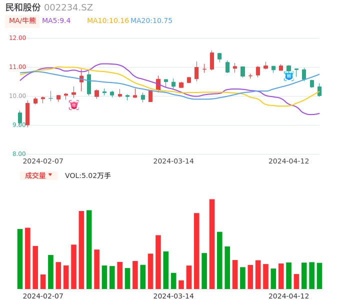 04月12日,民和股份收报10.01,股价涨幅-2.91%,成交金额5071.63万元,换手率1.66%。